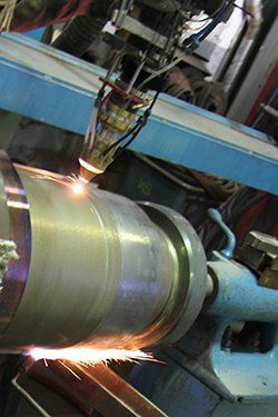 Nach den negativen Erfahrungen mit vorherigen Reparaturversuchen war das Walzwerk skeptisch gegenüber Standard-Schweißverfahren mit den für Lichtbogenschweißen üblichen Vorwärmtemperaturen von 150 bis 250 Grad Celsius. Bei der Abkühlung entstehen bei dem verwendeten Werkstoff Gefügeveränderungen in Form von Aufhärtungen und damit steigt das Risiko, dass so druckbelastete Bauteile wie Richtachsen im Prozess reißen. Bei der Ultraschallprüfung der Achse durch Schmidtke & Sohn zeigten sich nach der Demontage bereits Risse, sodass man dort ebenfalls konventionelle Schweißmethoden als nicht prozesssicher ausschloss. Als Lösung wählte man deshalb Laserauftragschweißen und zog dafür den Oberflächenspezialisten Pallas hinzu, mit dem man bei einem vergleichbaren Projekt in der Vergangenheit schon einmal erfolgreich zusammengearbeitet hatte. Bei diesem Verfahren schmilzt Pallas per Laserstrahl ein schichtweise per Düse eingestrahltes Pulver und eine dünne Randschicht der Grundwerkstoffoberfläche eng fokussiert auf. Dabei verbinden sich die beiden Werkstoffe zu einer schmelzmetallurgisch angebundenen Schicht mit geringer Aufmischung. Sie haftet auch bei extremer Belastung dauerhaft. Die auf eine kleine Fläche und wenige Sekunden begrenzte Energiezufuhr gewährleistet eine verzugsfreie Bearbeitung des Werkstücks. Das dafür benötigte komplexe Werkstoffwissen und die erforderliche Bearbeitungstechnologie bietet Pallas aus einer Hand. Diese gebündelte Verfahrenskompetenz stellte der Experte für anspruchsvolle Reparaturaufgaben bei der Richtachse einmal mehr unter Beweis. Anhand eines Probestücks machte Pallas zunächst verschiedene Schweißversuche mit einem Hochleistungslaser. So konnte nachgewiesen werden, dass durch geeignete Wahl der Schweißparameter und Zusatzwerkstoffe keine Gefügeveränderungen oder Aufhärtungen im Bauteil entstehen. Nach Freigabe der Schweißprobe durch das Walzwerk erfolgte die Umsetzung bei Schmidtke & Sohn im Werk. Dafür sprach die dort zur Drehung der drei Tonnen schweren Achse vorhandene Schweißvorrichtung. Zudem konnte – nach entsprechenden Umbauten – der von Pallas mitgebrachte Laser nebst Optik an die UP-Schweißanlage angeschlossen werden.