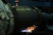 Angesichts der Größe der zu bearbeitenden Fläche von 370 Millimetern Durchmesser auf einer Länge von 330 Millimetern war sehr spezifisches Know-how gefordert. Deshalb betreute Pallas Geschäftsführer Stephan Kalawrytinos diese Aufgabe selber. So musste der sehr genau zu führende Prozess in der für den Spezialisten unbekannten Umgebung so eingerichtet werden, dass die Schweißnaht erfolgreich appliziert werden konnte. Dazu galt es nicht nur, die Besonderheit des Werkstoffs genau zu kennen, sondern auch eine ausgeklügelte Temperaturführung zu gewährleisten. Mit der Flamme wurde der entsprechende Bereich jeweils vorgewärmt und, mit Temperaturfühler versehen, eingepackt. Auch während des Laserauftragschweißens wurde das Bauteil permanent weiter gewärmt. Um auf Nummer sicher zu gehen, setzten die Spezialisten von Pallas zum Schweißen den gleichen Laser ein, der schon in den Vorversuchen genutzt wurde. Dabei arbeiteten sie mit einem drei Millimeter großen Brennfleck, um die zweilagige Beschichtung aufzuschweißen. Das händische Auftragen der Schichten im Zehntelmillimeterbereich erforderte beim Schweißen mit der langsam verfahrenden Schweißvorrichtung höchste Präzision – und das zehn Stunden lang je Lage. Die anschließende Überprüfung durch Schmidtke & Sohn wies nach, dass keine Lunker bei der Bearbeitung entstanden waren und die Beschichtung auch bei Belastung nicht abplatzt. Zwischenzeitlich hatte das Walzwerk jedoch einen zweiten Auftrag für eine weitere Richtachsenreparatur bei dem Dinslakener Reparaturbetrieb platziert und dieser die erforderlichen Arbeiten daran bis zur Schweißvorbereitung auch schon umgesetzt. Dadurch konnte Pallas mit der Regenerierung dieser Achse per Laserauftragschweißen nahtlos an den ersten Auftrag anschließen, sodass entsprechende Rüstzeiten entfielen. Währenddessen fräste das Team von Schmidtke & Sohn die erste Welle auf Fertigmaß und baute die Richtachse wieder zusammen. So erhielt das Walzwerk nach insgesamt nur zwei Monaten und einer Woche Bearbeitungszeit beide Walzen voll funktionsfähig zurück.