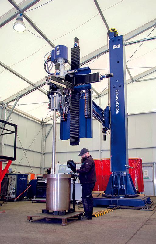 Da die Zeit drängte und die endgültige Konfiguration mit dem großen Automatenträger noch nicht zur Verfügung stand, wurden die Verfahrensprüfungen mit einer von der Firma Polysoude auf dem Gelände von AER provisorisch installierten „TIGer“-Anlage durchge-führt. Zu den Aufgaben von AER gehörte es auch, eine Vorrichtung zu planen und herzustellen, die es erlaubte, das Werkstück in den fünf festgelegten Positionen zu halten.